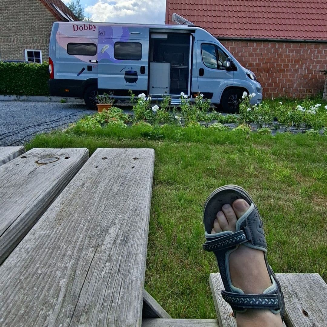 Bij droog weer gaan we zéker buiten werken en snuiven we extra inspiratie op tijdens onze middagwandeling. Bij slecht weer blijven we gezellig binnen zitten in Dobby, waar ik het lekker warm kan maken. Het weer mag ons niet tegenhouden. Integendeel, ritmische regen op het dak maakt onze contentbubbel alleen maar magischer. Alleen als het sneeuwt en/of vriest, kom ik niet buiten met Dobby. Dat zou hij niet overleven, vrees ik.