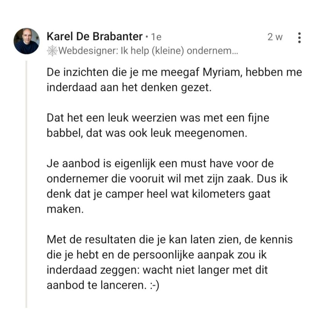 Dit camperaanbod is fonkelnieuw sinds de zomer van 2025. Dus ik heb nog geen lange lijst met testimonials (misschien straks wel eentje van jou? 😎). Karel was mijn camperproefkonijn. Na amper 2 uur brainstormen kreeg hij al helderheid, nieuwe ideeën en hernieuwde goesting.
