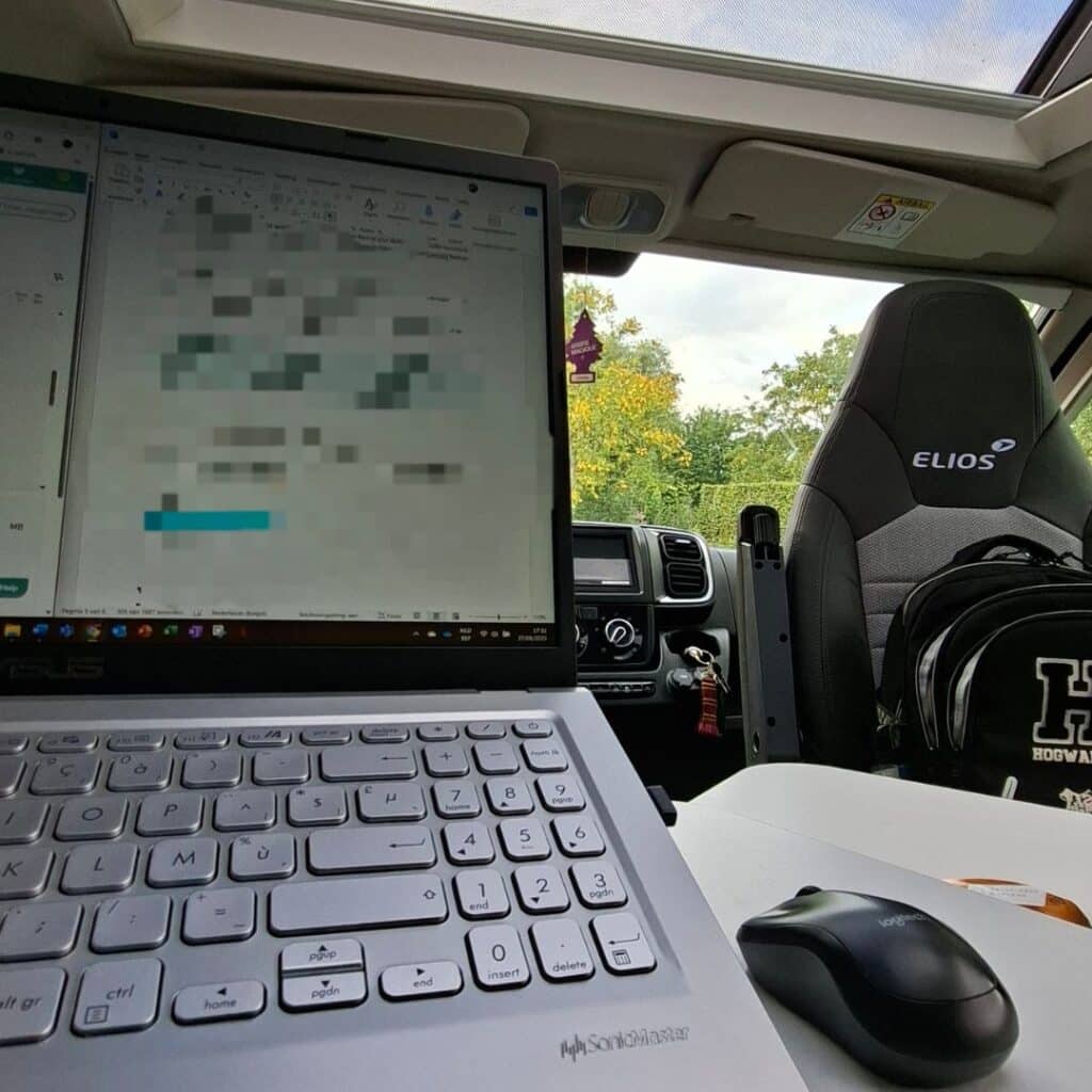 Uiteraard breng je laptop, gsm en opladers mee. Zorg ook dat je toegang hebt tot je website, je socials en andere online platformen. En verder: een open geest. De meeste campings hebben gratis parkeerplaats voor bezoekers. Ik check dit sowieso ook als ik ons plekje reserveer.